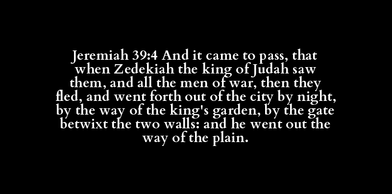 Jeremiah 39:4 And it came to pass, that when Zedekiah the king of Judah saw them, and all the men of war, then they fled, and went forth out of the city by night, by the way of the king's garden, by the gate betwixt the two walls: and he went out the way of the plain.