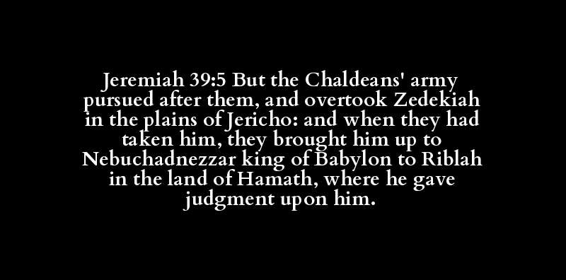 Jeremiah 39:5 But the Chaldeans' army pursued after them, and overtook Zedekiah in the plains of Jericho: and when they had taken him, they brought him up to Nebuchadnezzar king of Babylon to Riblah in the land of Hamath, where he gave judgment upon him.