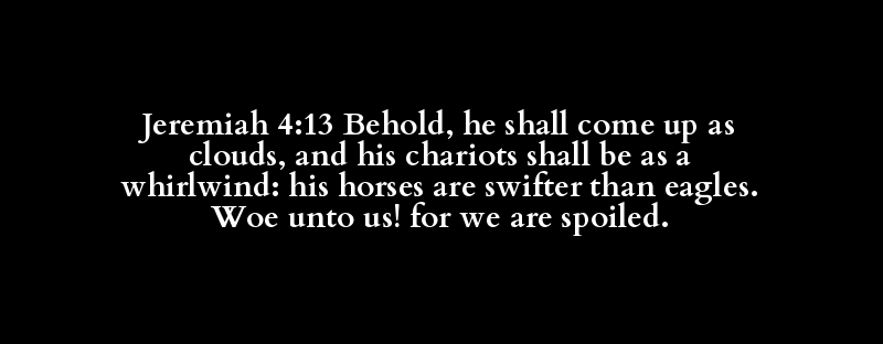 Jeremiah 4:13 Behold, he shall come up as clouds, and his chariots shall be as a whirlwind: his horses are swifter than eagles. Woe unto us! for we are spoiled.