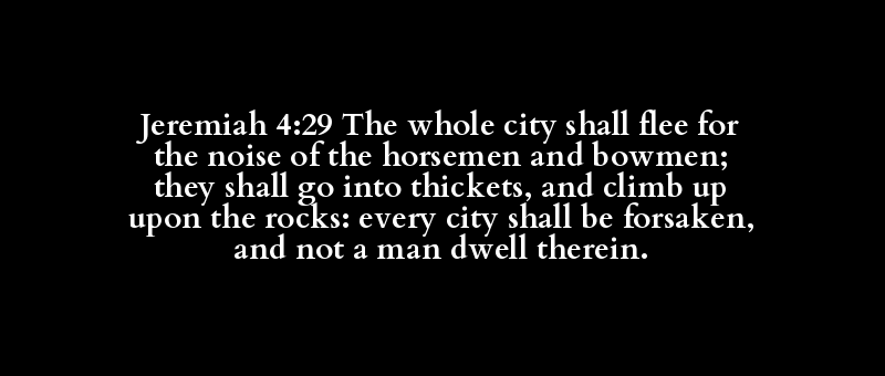 Jeremiah 4:29 The whole city shall flee for the noise of the horsemen and bowmen; they shall go into thickets, and climb up upon the rocks: every city shall be forsaken, and not a man dwell therein.