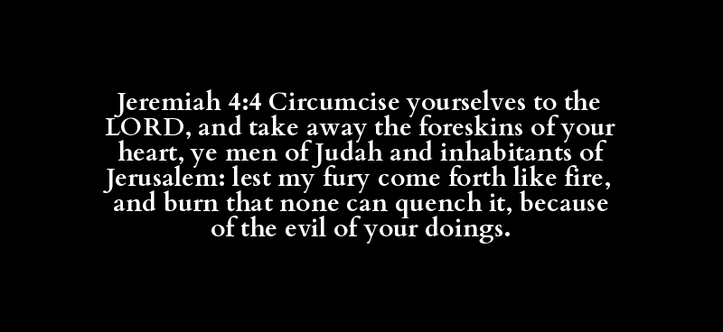 Jeremiah 4:4 Circumcise yourselves to the LORD, and take away the foreskins of your heart, ye men of Judah and inhabitants of Jerusalem: lest my fury come forth like fire, and burn that none can quench it, because of the evil of your doings.