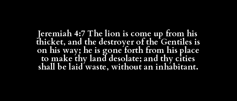 Jeremiah 4:7 The lion is come up from his thicket, and the destroyer of the Gentiles is on his way; he is gone forth from his place to make thy land desolate; and thy cities shall be laid waste, without an inhabitant.