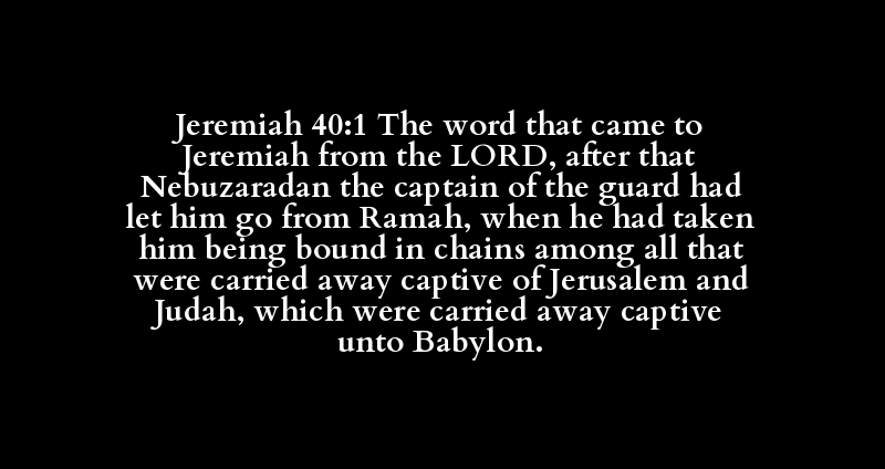 Jeremiah 40:1 The word that came to Jeremiah from the LORD, after that Nebuzaradan the captain of the guard had let him go from Ramah, when he had taken him being bound in chains among all that were carried away captive of Jerusalem and Judah, which were carried away captive unto Babylon.