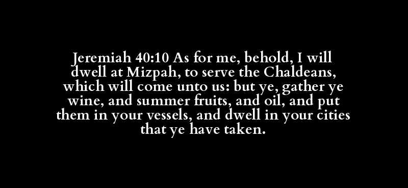Jeremiah 40:10 As for me, behold, I will dwell at Mizpah, to serve the Chaldeans, which will come unto us: but ye, gather ye wine, and summer fruits, and oil, and put them in your vessels, and dwell in your cities that ye have taken.