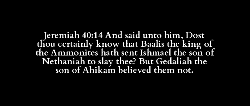 Jeremiah 40:14 And said unto him, Dost thou certainly know that Baalis the king of the Ammonites hath sent Ishmael the son of Nethaniah to slay thee? But Gedaliah the son of Ahikam believed them not.