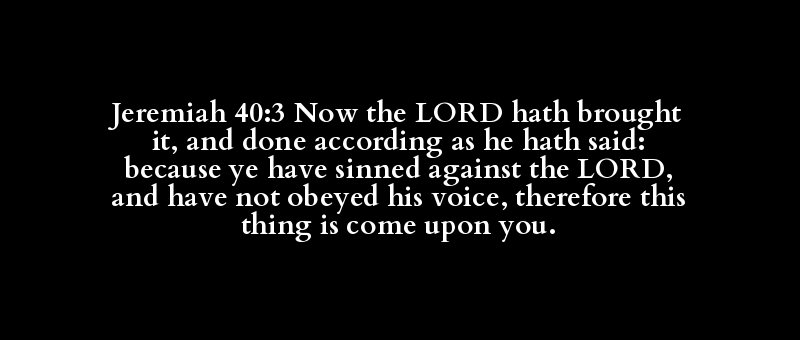 Jeremiah 40:3 Now the LORD hath brought it, and done according as he hath said: because ye have sinned against the LORD, and have not obeyed his voice, therefore this thing is come upon you.