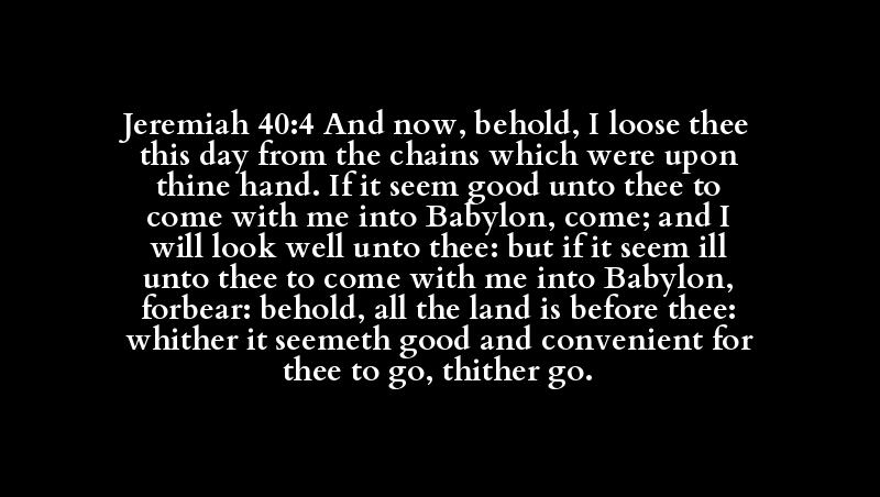 Jeremiah 40:4 And now, behold, I loose thee this day from the chains which were upon thine hand. If it seem good unto thee to come with me into Babylon, come; and I will look well unto thee: but if it seem ill unto thee to come with me into Babylon, forbear: behold, all the land is before thee: whither it seemeth good and convenient for thee to go, thither go.