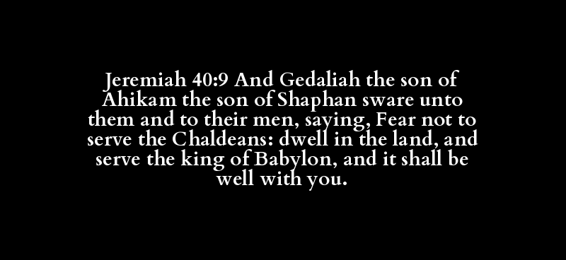 Jeremiah 40:9 And Gedaliah the son of Ahikam the son of Shaphan sware unto them and to their men, saying, Fear not to serve the Chaldeans: dwell in the land, and serve the king of Babylon, and it shall be well with you.