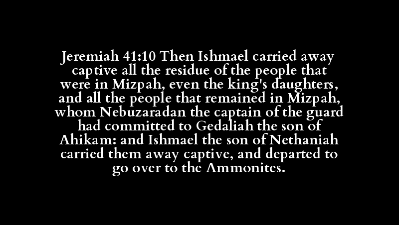 Jeremiah 41:10 Then Ishmael carried away captive all the residue of the people that were in Mizpah, even the king's daughters, and all the people that remained in Mizpah, whom Nebuzaradan the captain of the guard had committed to Gedaliah the son of Ahikam: and Ishmael the son of Nethaniah carried them away captive, and departed to go over to the Ammonites.
