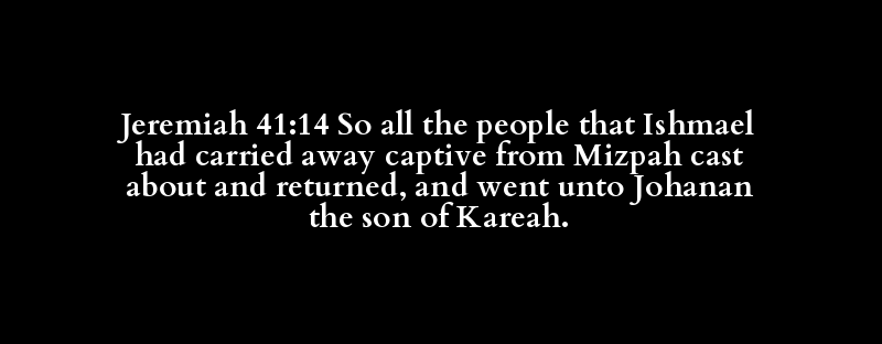 Jeremiah 41:14 So all the people that Ishmael had carried away captive from Mizpah cast about and returned, and went unto Johanan the son of Kareah.