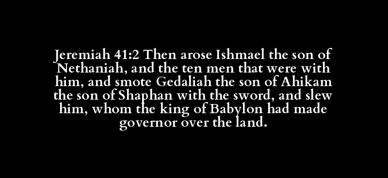 Jeremiah 41:2 Then arose Ishmael the son of Nethaniah, and the ten men that were with him, and smote Gedaliah the son of Ahikam the son of Shaphan with the sword, and slew him, whom the king of Babylon had made governor over the land.