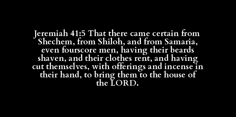 Jeremiah 41:5 That there came certain from Shechem, from Shiloh, and from Samaria, even fourscore men, having their beards shaven, and their clothes rent, and having cut themselves, with offerings and incense in their hand, to bring them to the house of the LORD.