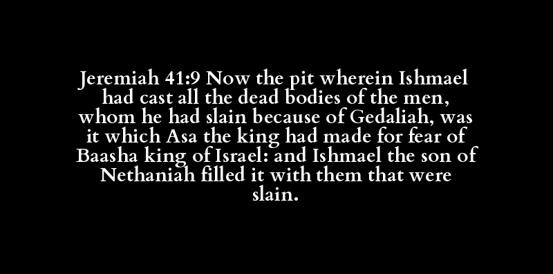Jeremiah 41:9 Now the pit wherein Ishmael had cast all the dead bodies of the men, whom he had slain because of Gedaliah, was it which Asa the king had made for fear of Baasha king of Israel: and Ishmael the son of Nethaniah filled it with them that were slain.