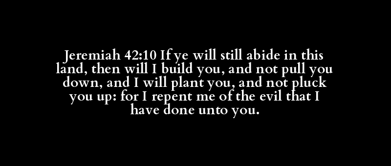 Jeremiah 42:10 If ye will still abide in this land, then will I build you, and not pull you down, and I will plant you, and not pluck you up: for I repent me of the evil that I have done unto you.
