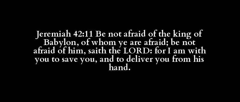 Jeremiah 42:11 Be not afraid of the king of Babylon, of whom ye are afraid; be not afraid of him, saith the LORD: for I am with you to save you, and to deliver you from his hand.