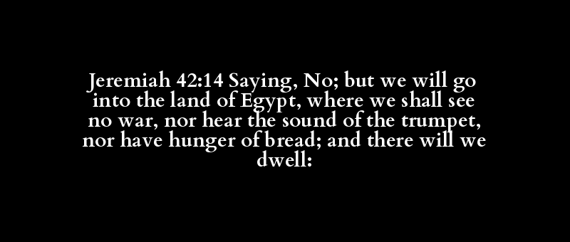 Jeremiah 42:14 Saying, No; but we will go into the land of Egypt, where we shall see no war, nor hear the sound of the trumpet, nor have hunger of bread; and there will we dwell: