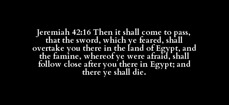 Jeremiah 42:16 Then it shall come to pass, that the sword, which ye feared, shall overtake you there in the land of Egypt, and the famine, whereof ye were afraid, shall follow close after you there in Egypt; and there ye shall die.
