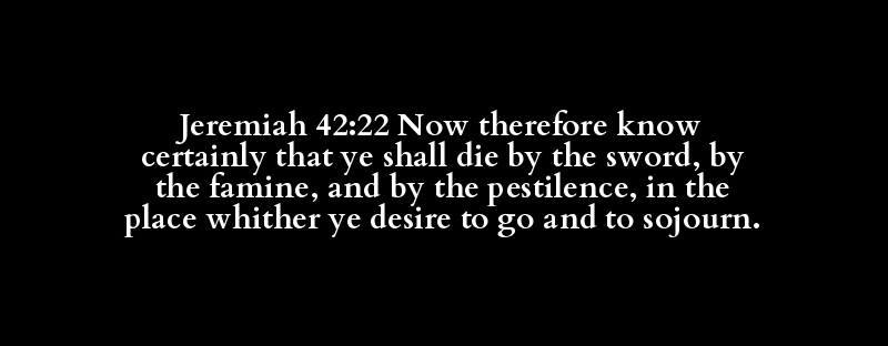 Jeremiah 42:22 Now therefore know certainly that ye shall die by the sword, by the famine, and by the pestilence, in the place whither ye desire to go and to sojourn.