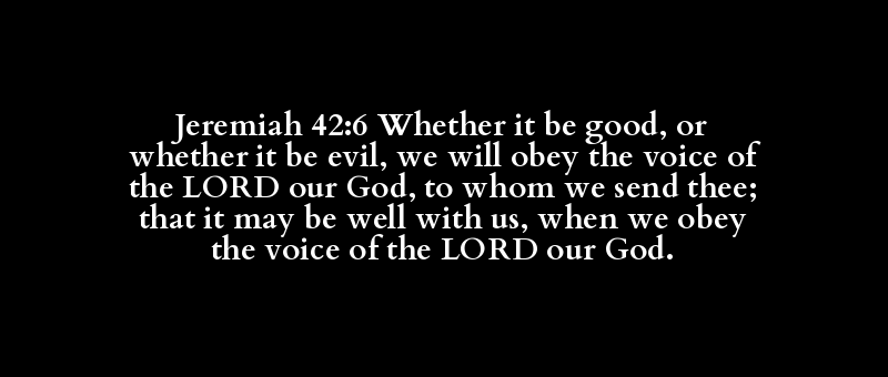 Jeremiah 42:6 Whether it be good, or whether it be evil, we will obey the voice of the LORD our God, to whom we send thee; that it may be well with us, when we obey the voice of the LORD our God.