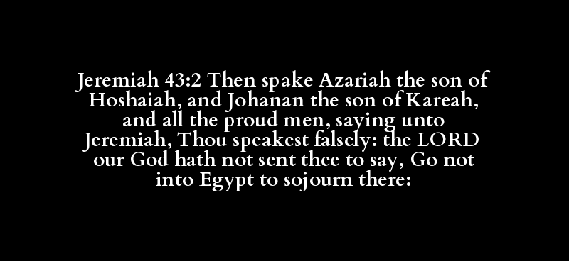 Jeremiah 43:2 Then spake Azariah the son of Hoshaiah, and Johanan the son of Kareah, and all the proud men, saying unto Jeremiah, Thou speakest falsely: the LORD our God hath not sent thee to say, Go not into Egypt to sojourn there: