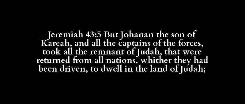 Jeremiah 43:5 But Johanan the son of Kareah, and all the captains of the forces, took all the remnant of Judah, that were returned from all nations, whither they had been driven, to dwell in the land of Judah;