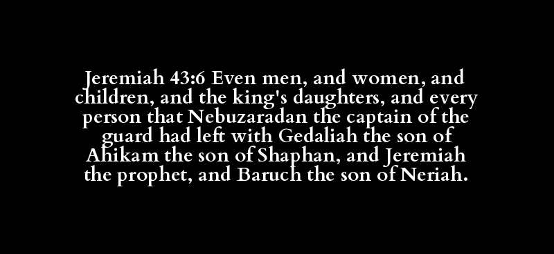 Jeremiah 43:6 Even men, and women, and children, and the king's daughters, and every person that Nebuzaradan the captain of the guard had left with Gedaliah the son of Ahikam the son of Shaphan, and Jeremiah the prophet, and Baruch the son of Neriah.