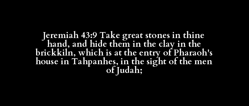 Jeremiah 43:9 Take great stones in thine hand, and hide them in the clay in the brickkiln, which is at the entry of Pharaoh's house in Tahpanhes, in the sight of the men of Judah;