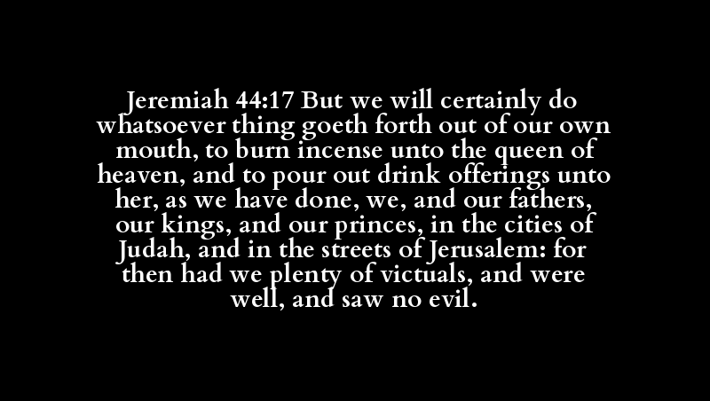 Jeremiah 44:17 But we will certainly do whatsoever thing goeth forth out of our own mouth, to burn incense unto the queen of heaven, and to pour out drink offerings unto her, as we have done, we, and our fathers, our kings, and our princes, in the cities of Judah, and in the streets of Jerusalem: for then had we plenty of victuals, and were well, and saw no evil.