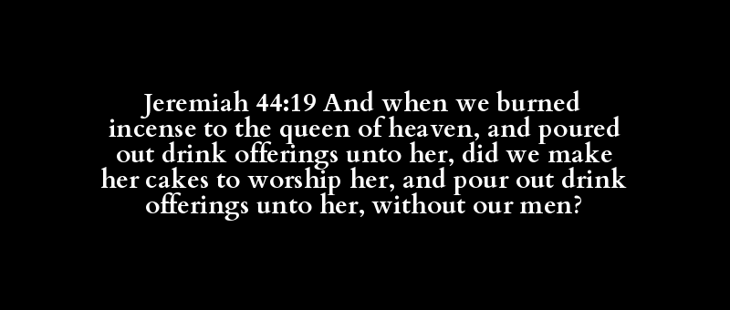 Jeremiah 44:19 And when we burned incense to the queen of heaven, and poured out drink offerings unto her, did we make her cakes to worship her, and pour out drink offerings unto her, without our men?
