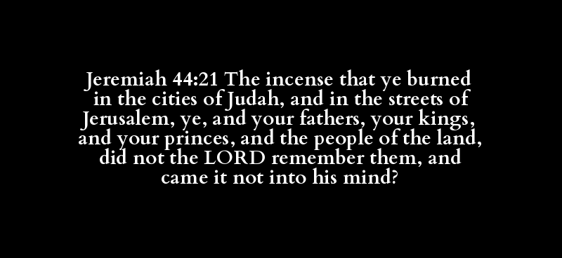Jeremiah 44:21 The incense that ye burned in the cities of Judah, and in the streets of Jerusalem, ye, and your fathers, your kings, and your princes, and the people of the land, did not the LORD remember them, and came it not into his mind?