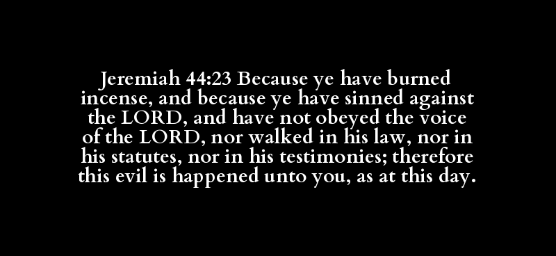 Jeremiah 44:23 Because ye have burned incense, and because ye have sinned against the LORD, and have not obeyed the voice of the LORD, nor walked in his law, nor in his statutes, nor in his testimonies; therefore this evil is happened unto you, as at this day.
