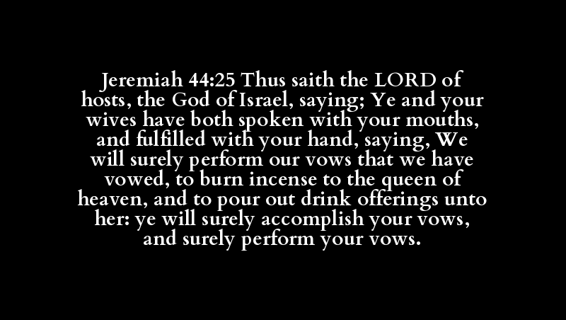 Jeremiah 44:25 Thus saith the LORD of hosts, the God of Israel, saying; Ye and your wives have both spoken with your mouths, and fulfilled with your hand, saying, We will surely perform our vows that we have vowed, to burn incense to the queen of heaven, and to pour out drink offerings unto her: ye will surely accomplish your vows, and surely perform your vows.