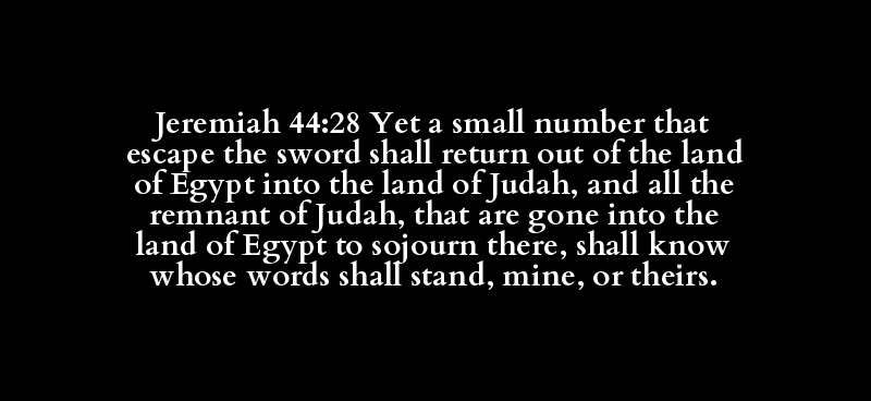 Jeremiah 44:28 Yet a small number that escape the sword shall return out of the land of Egypt into the land of Judah, and all the remnant of Judah, that are gone into the land of Egypt to sojourn there, shall know whose words shall stand, mine, or theirs.