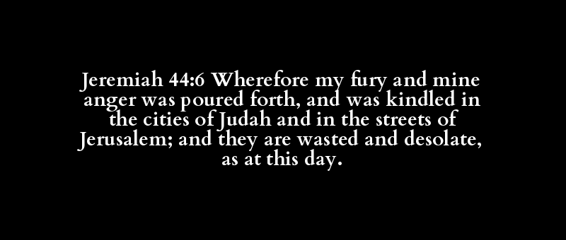 Jeremiah 44:6 Wherefore my fury and mine anger was poured forth, and was kindled in the cities of Judah and in the streets of Jerusalem; and they are wasted and desolate, as at this day.