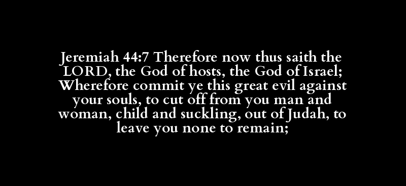 Jeremiah 44:7 Therefore now thus saith the LORD, the God of hosts, the God of Israel; Wherefore commit ye this great evil against your souls, to cut off from you man and woman, child and suckling, out of Judah, to leave you none to remain;