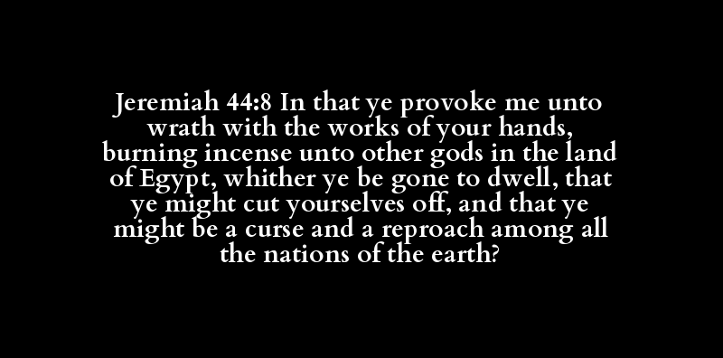 Jeremiah 44:8 In that ye provoke me unto wrath with the works of your hands, burning incense unto other gods in the land of Egypt, whither ye be gone to dwell, that ye might cut yourselves off, and that ye might be a curse and a reproach among all the nations of the earth?