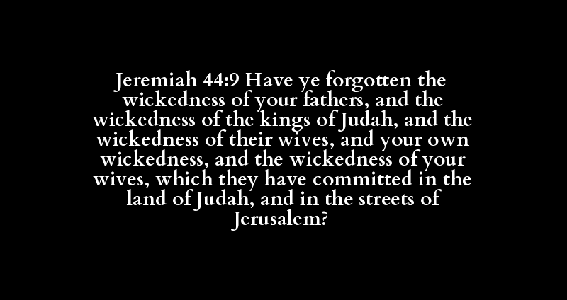 Jeremiah 44:9 Have ye forgotten the wickedness of your fathers, and the wickedness of the kings of Judah, and the wickedness of their wives, and your own wickedness, and the wickedness of your wives, which they have committed in the land of Judah, and in the streets of Jerusalem?