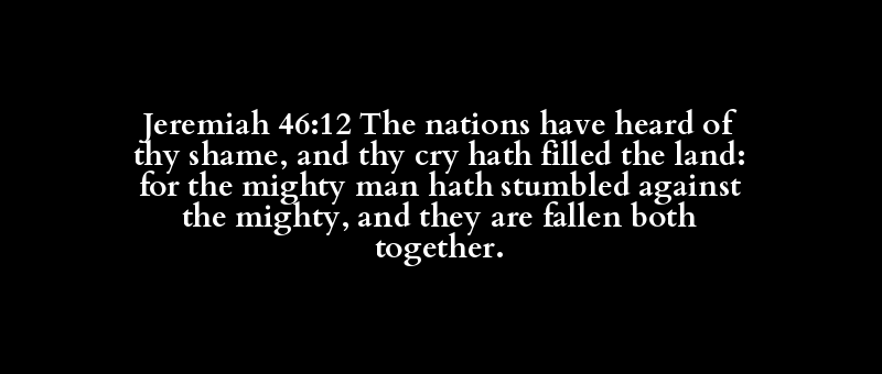 Jeremiah 46:12 The nations have heard of thy shame, and thy cry hath filled the land: for the mighty man hath stumbled against the mighty, and they are fallen both together.