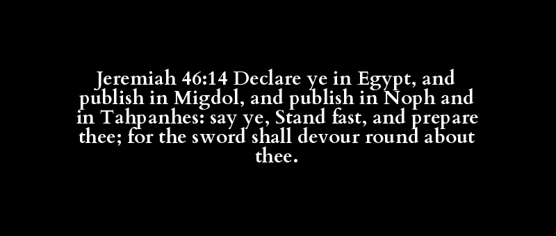 Jeremiah 46:14 Declare ye in Egypt, and publish in Migdol, and publish in Noph and in Tahpanhes: say ye, Stand fast, and prepare thee; for the sword shall devour round about thee.
