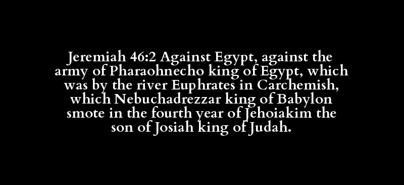 Jeremiah 46:2 Against Egypt, against the army of Pharaohnecho king of Egypt, which was by the river Euphrates in Carchemish, which Nebuchadrezzar king of Babylon smote in the fourth year of Jehoiakim the son of Josiah king of Judah.