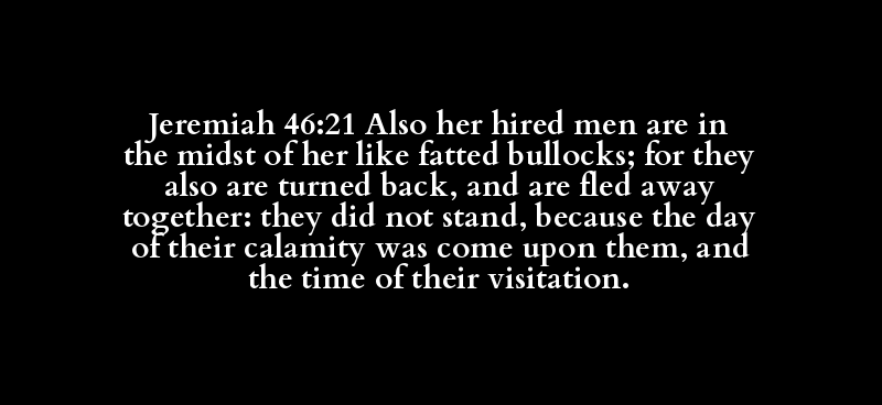 Jeremiah 46:21 Also her hired men are in the midst of her like fatted bullocks; for they also are turned back, and are fled away together: they did not stand, because the day of their calamity was come upon them, and the time of their visitation.
