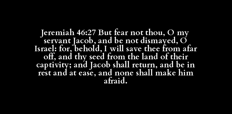 Jeremiah 46:27 But fear not thou, O my servant Jacob, and be not dismayed, O Israel: for, behold, I will save thee from afar off, and thy seed from the land of their captivity; and Jacob shall return, and be in rest and at ease, and none shall make him afraid.
