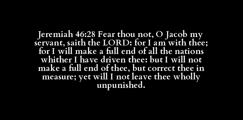 Jeremiah 46:28 Fear thou not, O Jacob my servant, saith the LORD: for I am with thee; for I will make a full end of all the nations whither I have driven thee: but I will not make a full end of thee, but correct thee in measure; yet will I not leave thee wholly unpunished.