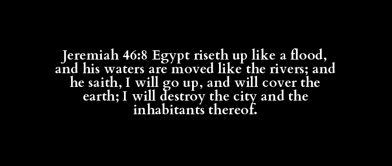 Jeremiah 46:8 Egypt riseth up like a flood, and his waters are moved like the rivers; and he saith, I will go up, and will cover the earth; I will destroy the city and the inhabitants thereof.