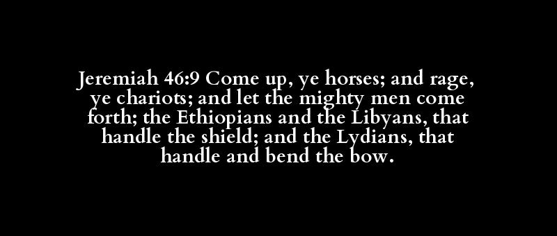 Jeremiah 46:9 Come up, ye horses; and rage, ye chariots; and let the mighty men come forth; the Ethiopians and the Libyans, that handle the shield; and the Lydians, that handle and bend the bow.