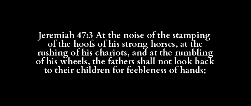 Jeremiah 47:3 At the noise of the stamping of the hoofs of his strong horses, at the rushing of his chariots, and at the rumbling of his wheels, the fathers shall not look back to their children for feebleness of hands;