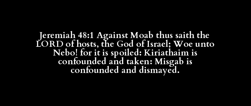 Jeremiah 48:1 Against Moab thus saith the LORD of hosts, the God of Israel; Woe unto Nebo! for it is spoiled: Kiriathaim is confounded and taken: Misgab is confounded and dismayed.