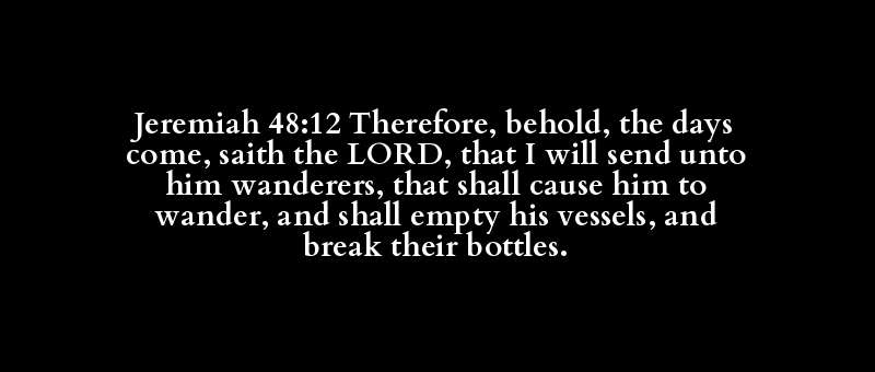 Jeremiah 48:12 Therefore, behold, the days come, saith the LORD, that I will send unto him wanderers, that shall cause him to wander, and shall empty his vessels, and break their bottles.