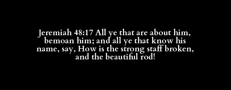 Jeremiah 48:17 All ye that are about him, bemoan him; and all ye that know his name, say, How is the strong staff broken, and the beautiful rod!