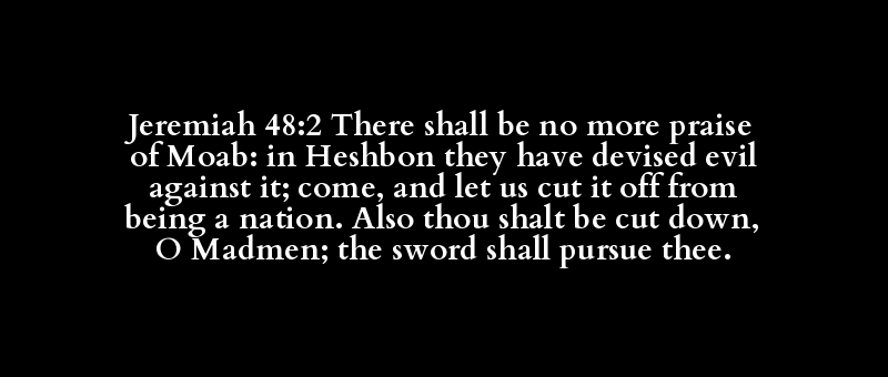 Jeremiah 48:2 There shall be no more praise of Moab: in Heshbon they have devised evil against it; come, and let us cut it off from being a nation. Also thou shalt be cut down, O Madmen; the sword shall pursue thee.